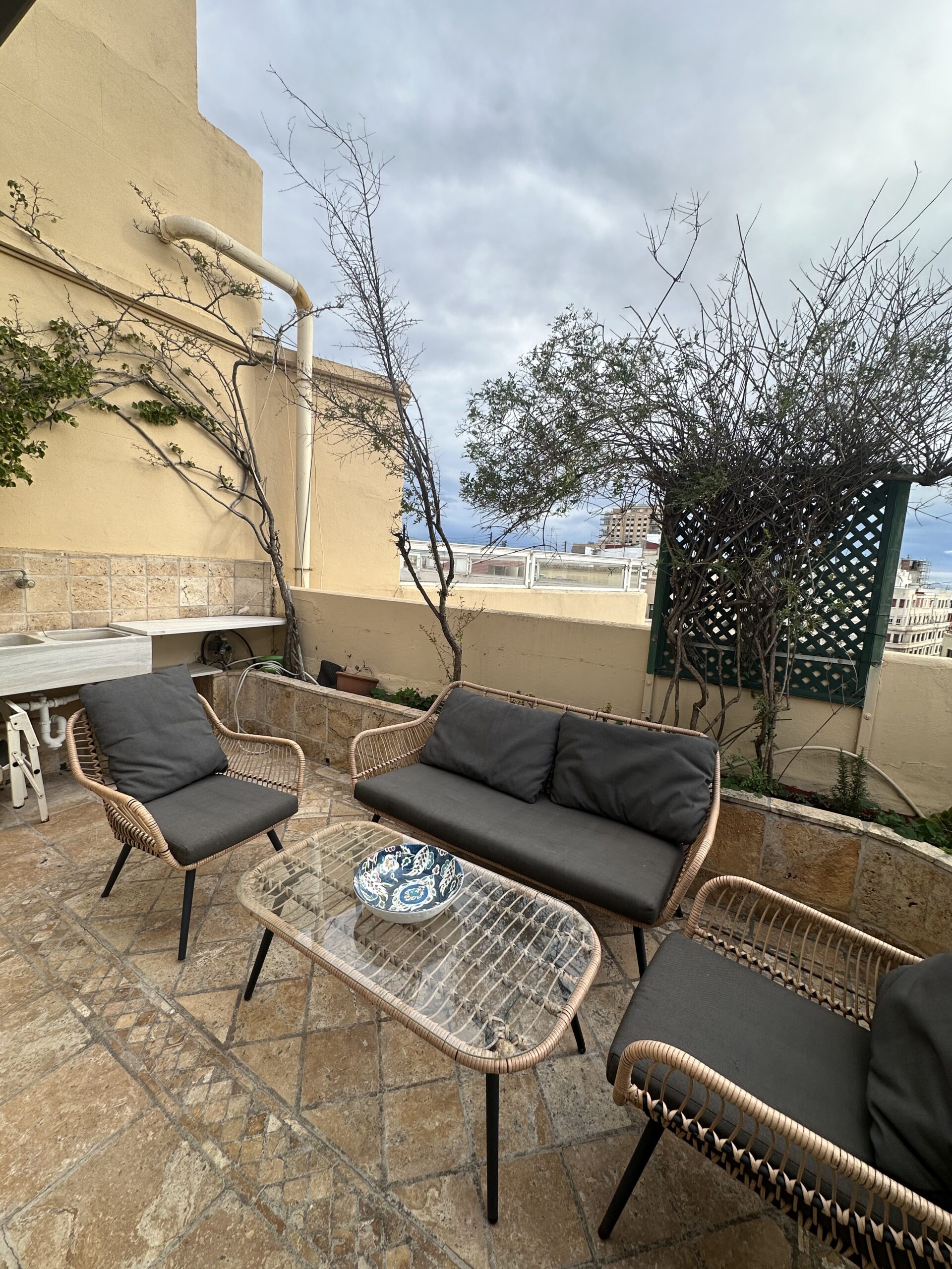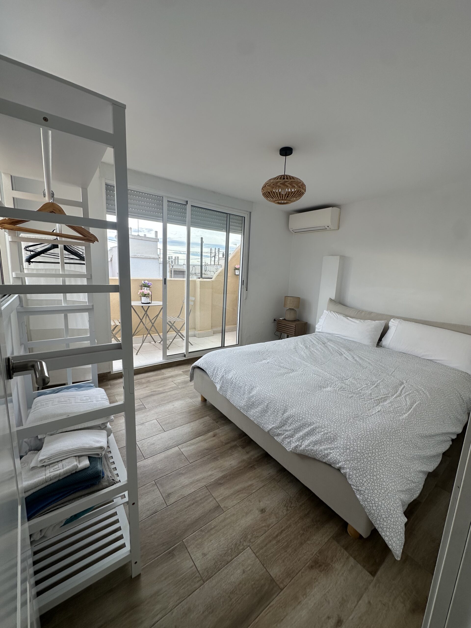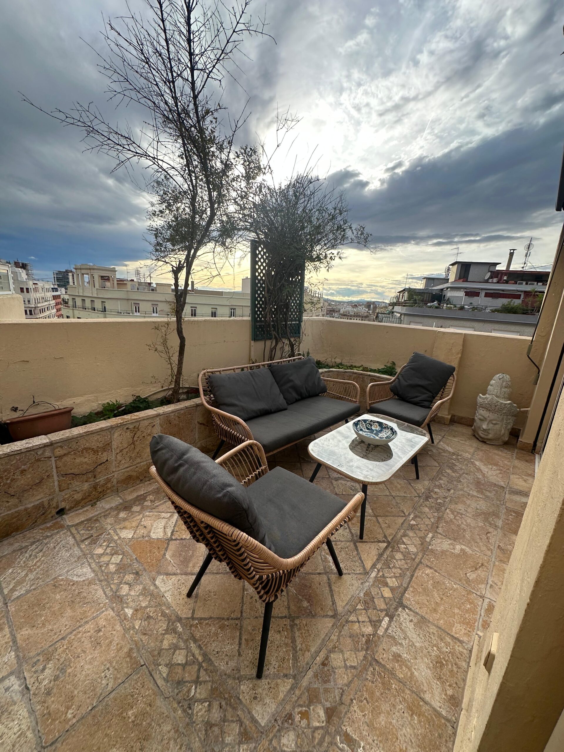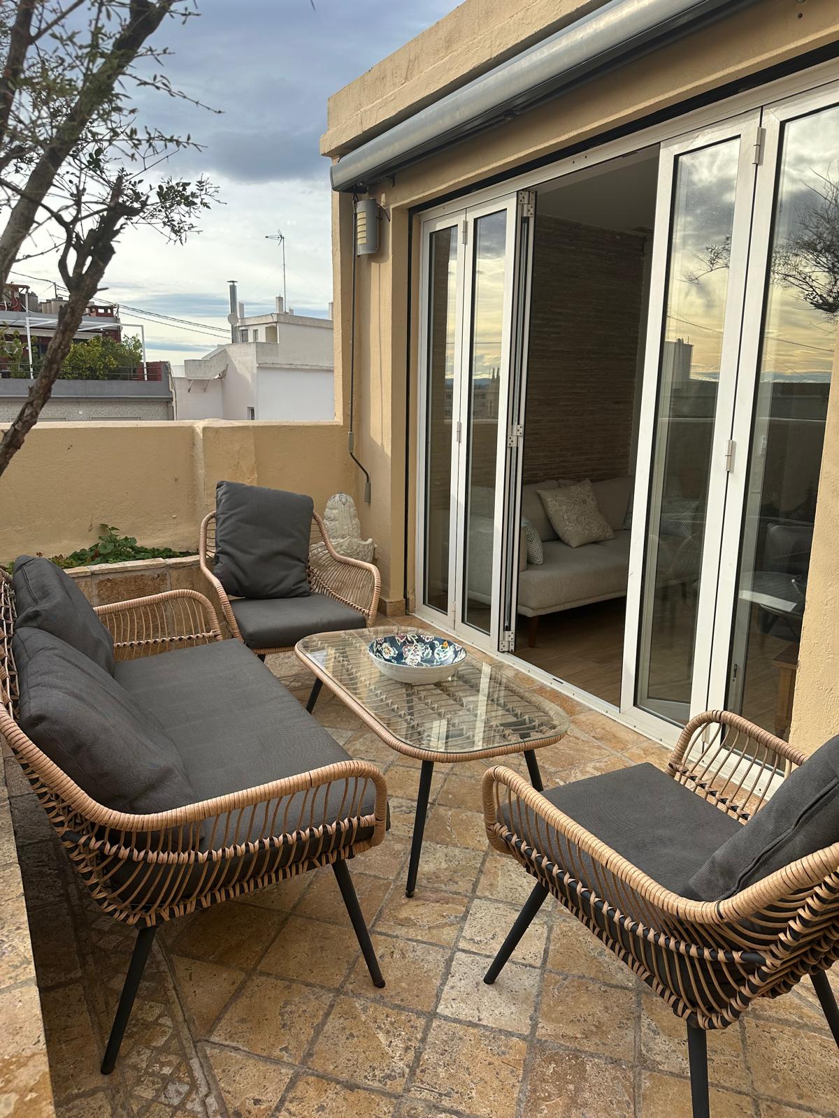 La terraza privada es el elemento más atractivo del apartamento. Desde ella se disfruta de una perspectiva elevada del centro histórico, perfecta para desconectar del ritmo de la ciudad sin salir de ella. Es un espacio pensado para aprovechar el clima de Valencia, ya sea con un desayuno tranquilo o una pausa al final de la jornada.