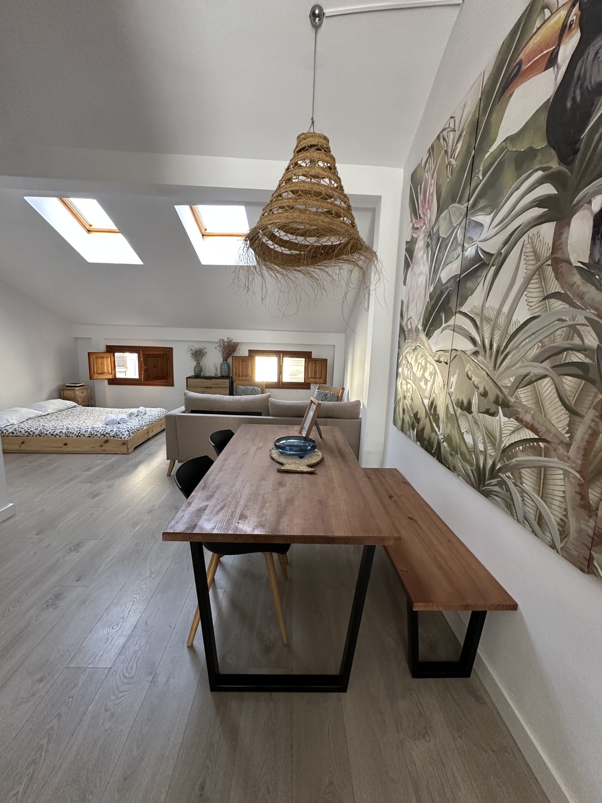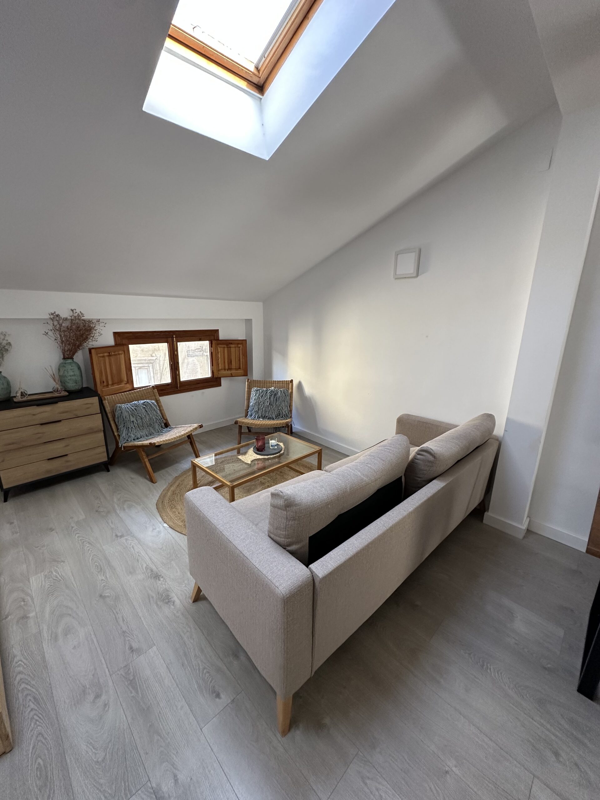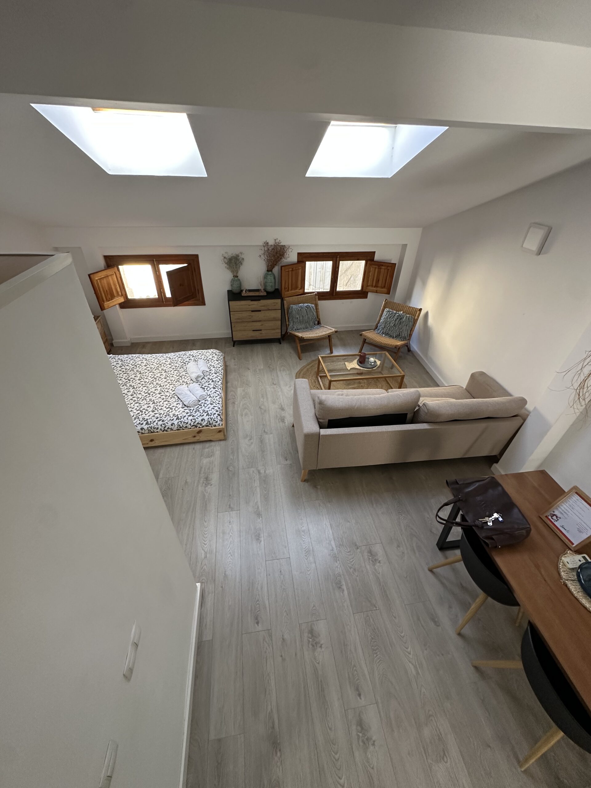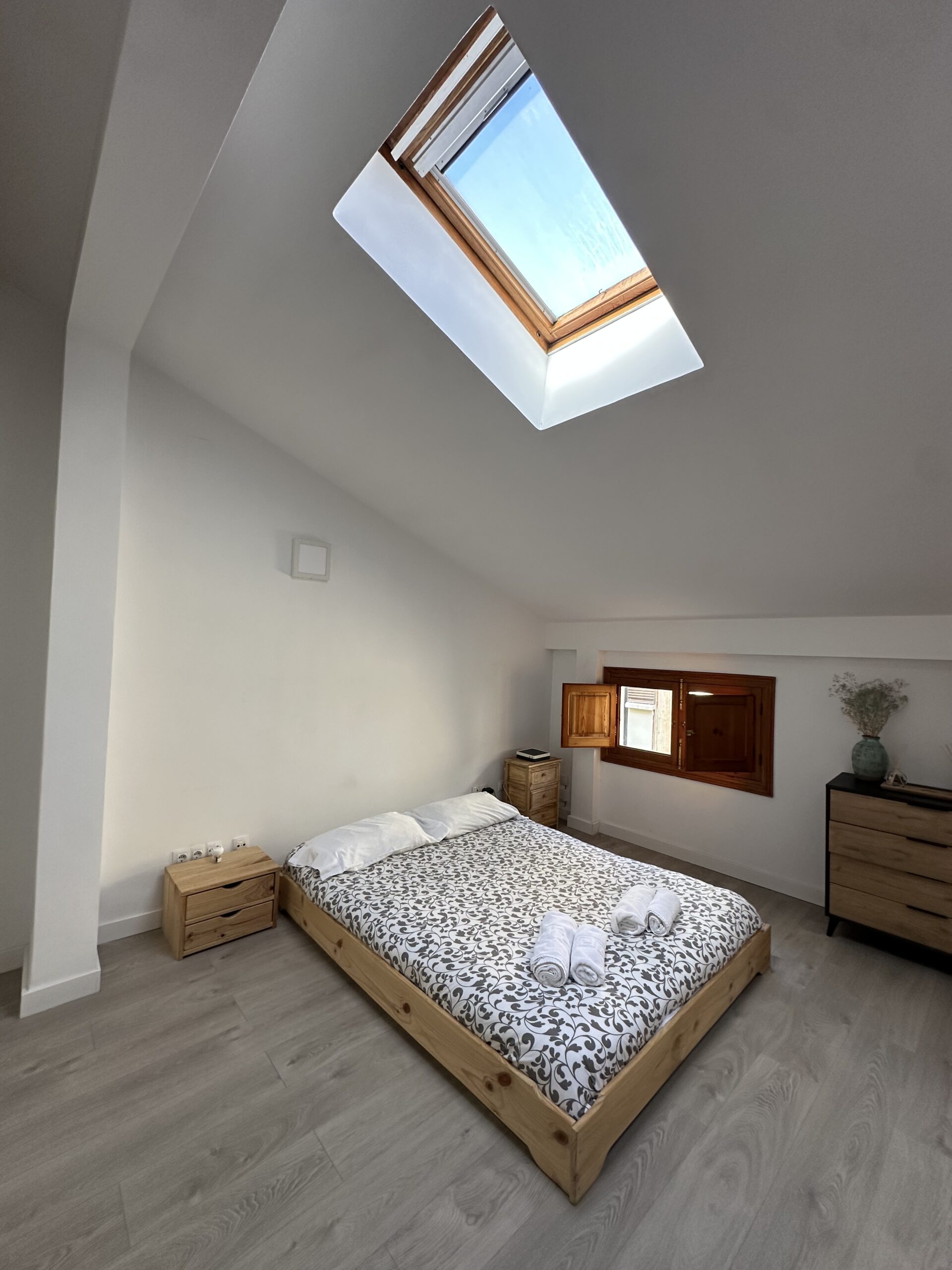 La vivienda dispone de una cocina totalmente equipada con electrodomésticos, un amplio y luminoso comedor-salón-dormitorio que aporta gran sensación de espacio y confort, un pequeño espacio altillo y un baño completamente equipado que incluye toallas y secador. También tiene aire acondicionado para que el calor no te impida descansar en las, a veces muy calurosas, noches estivales.