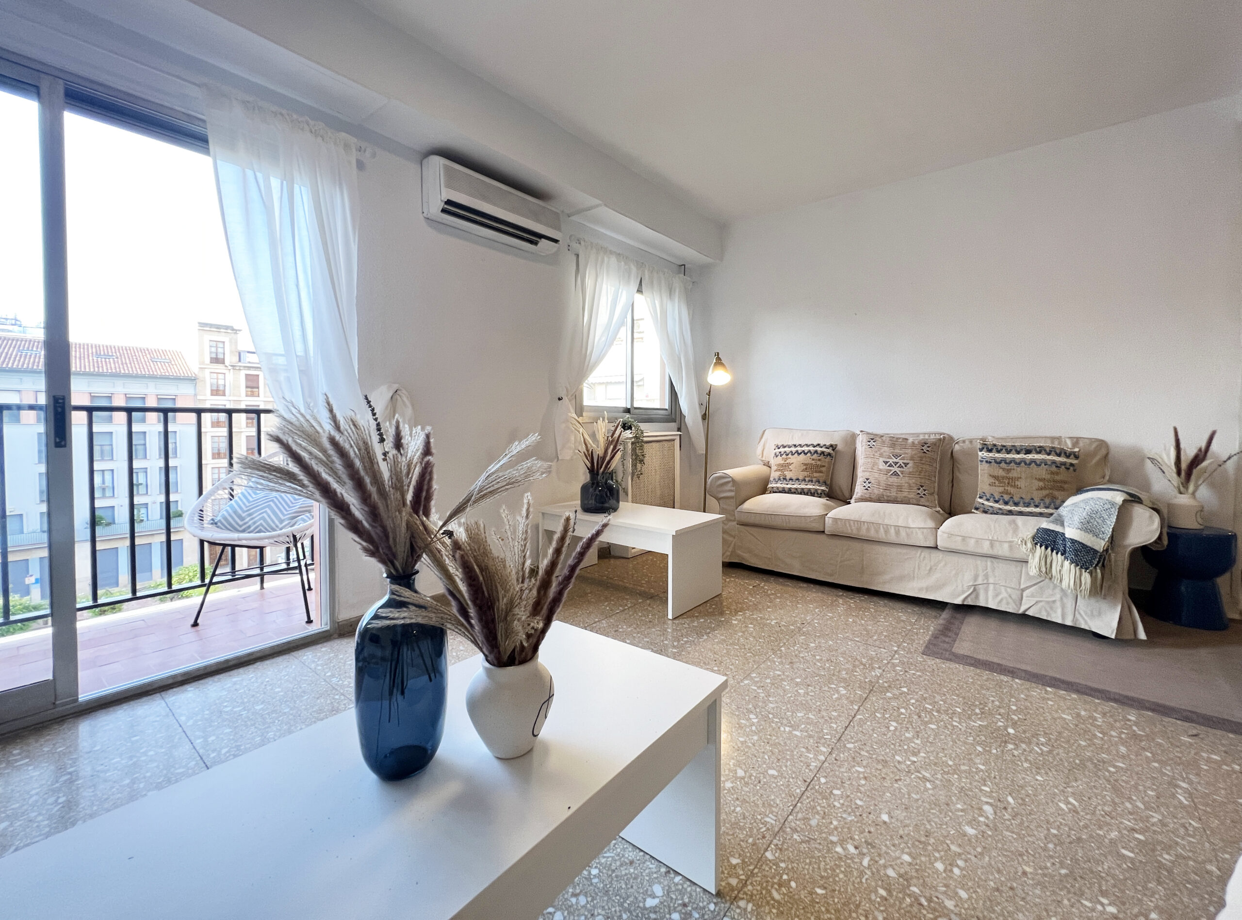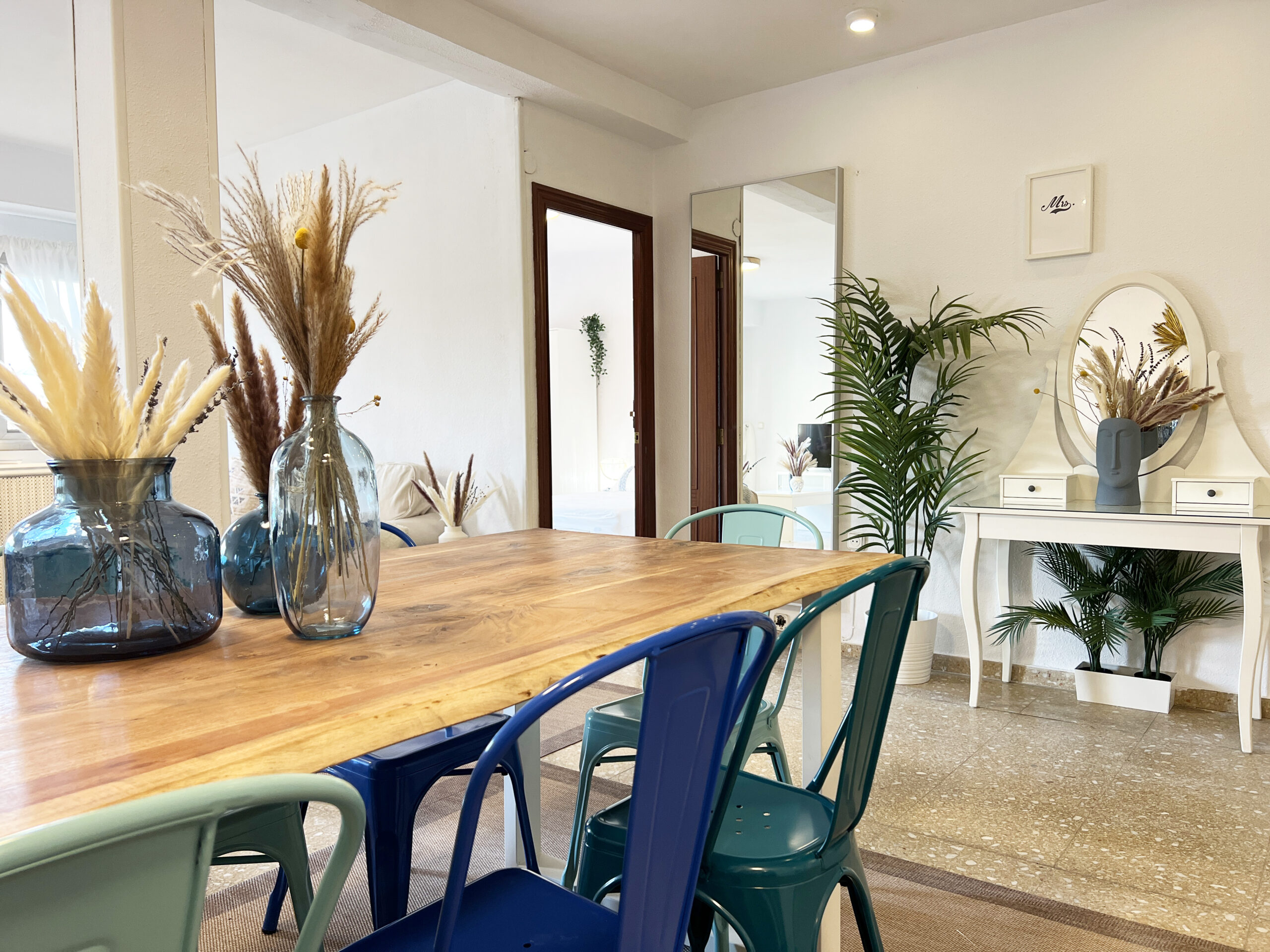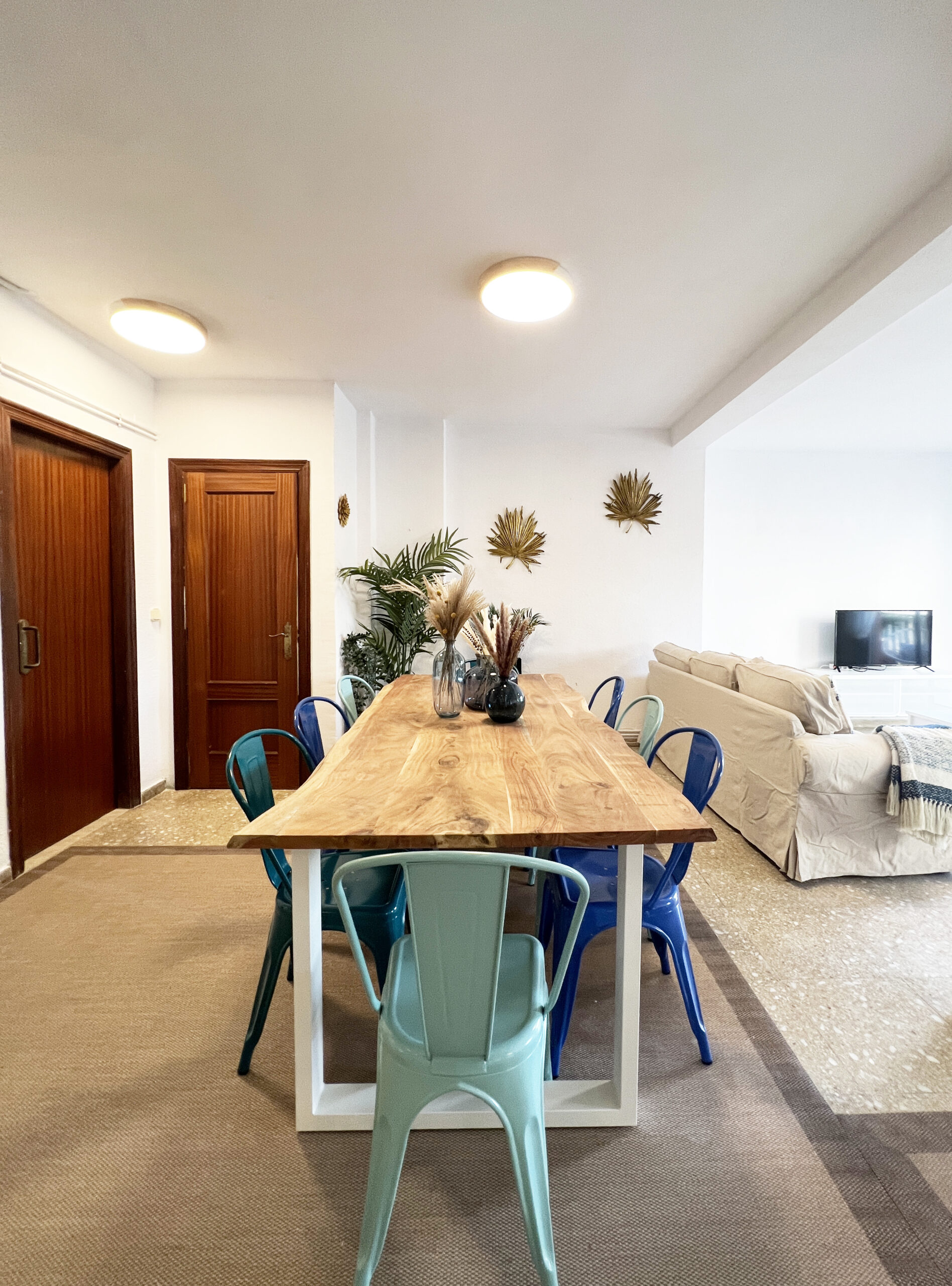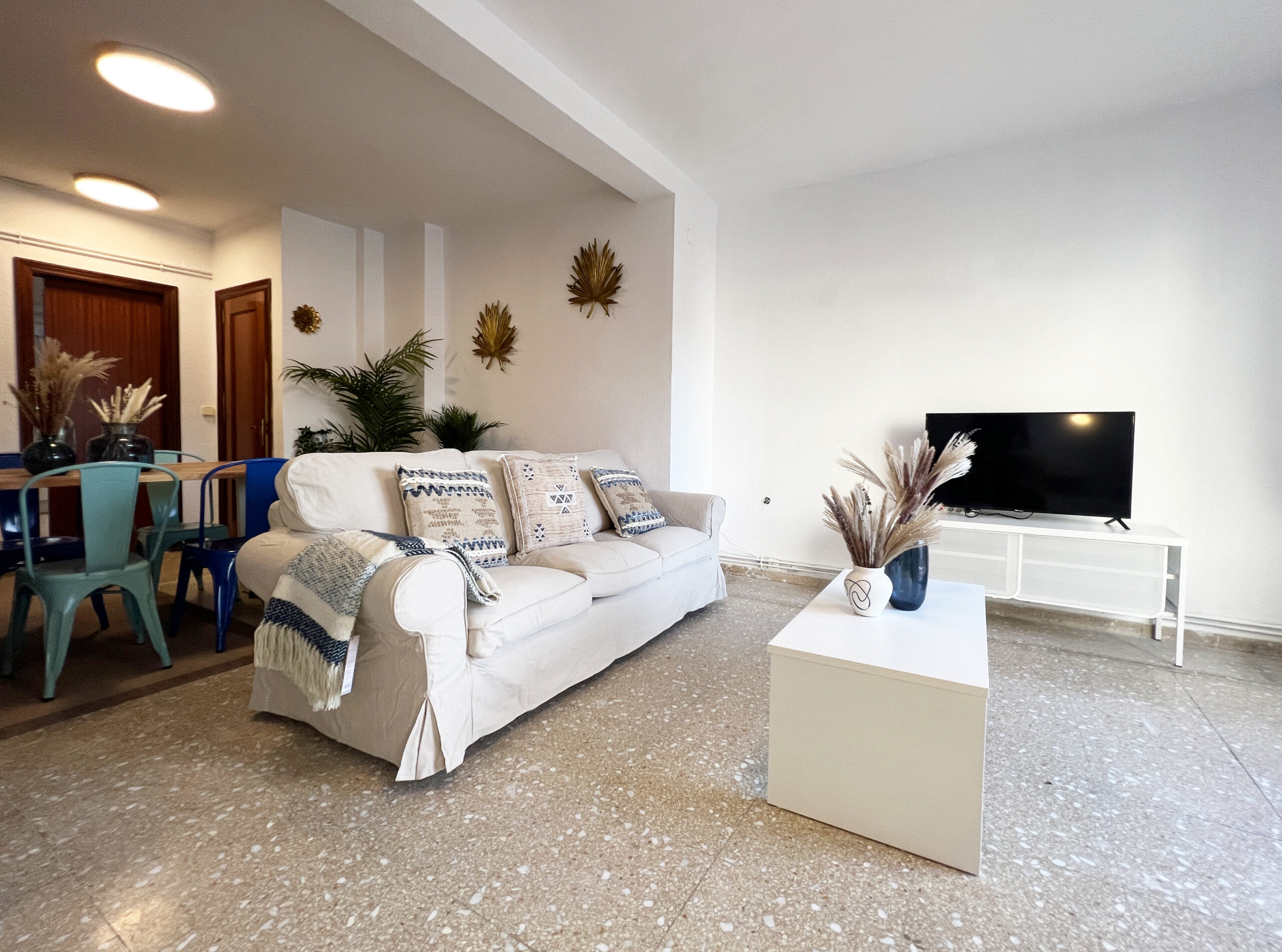 El salón-comedor se compone de dos cómodos sofás con mesita y televisión, dos mesitas altas con taburetes y mesa de comedor con sus ocho sillas. Desde esta zona se accede al agradable balcón desde donde podemos ver el mercado central y la cúpula del Real Colegio de las Escuelas Pías.