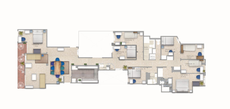 La vivienda dispone de ocho habitaciones, seis con camas dobles y una con cama individual, cuatro cuartos de baño (dos de uso privado para las habitaciones 7 y 8), cocina, salón-comedor y un amplio balcón. Disfrutarás de su agradable espacio al aire libre tanto en invierno como en verano.