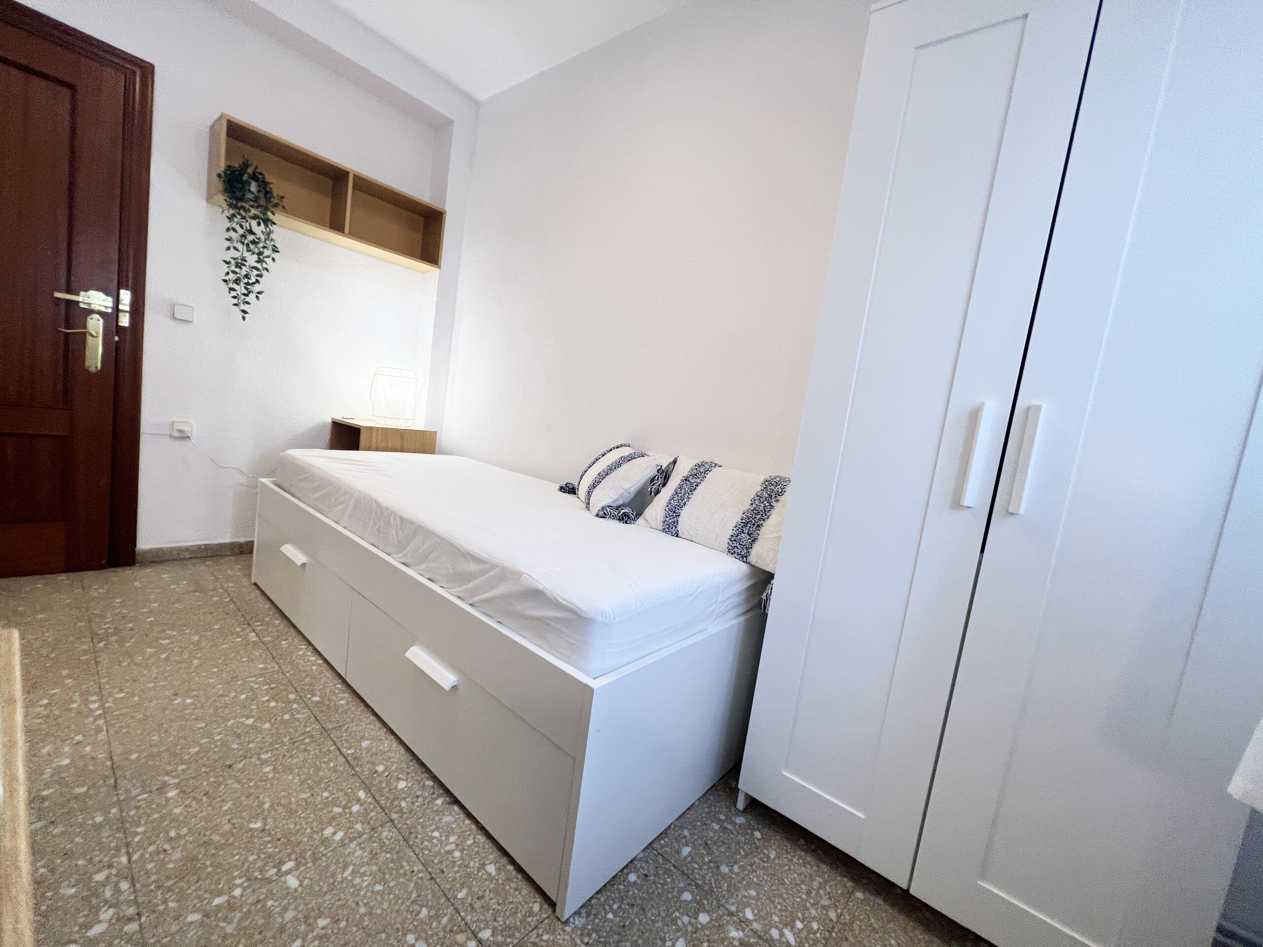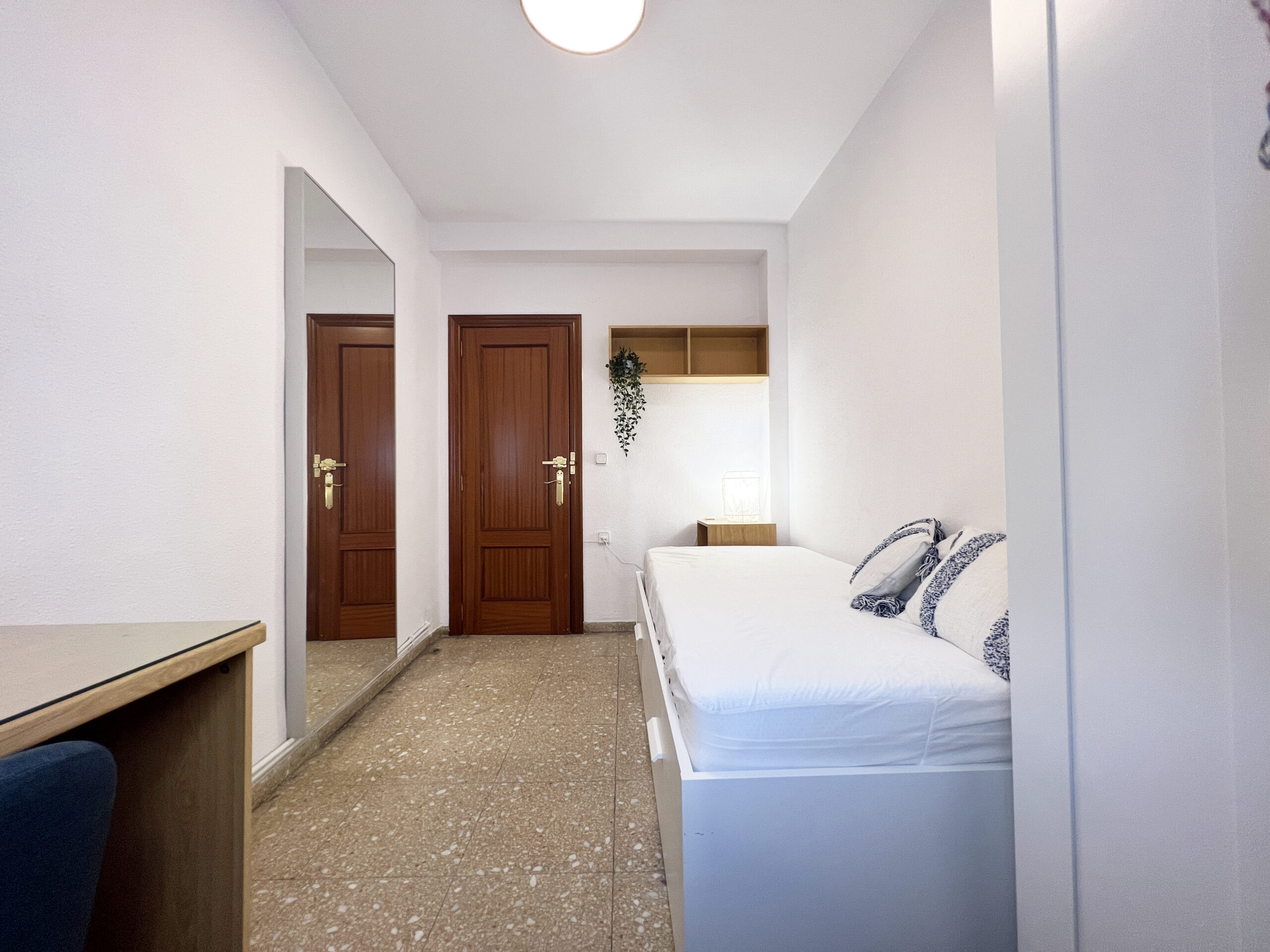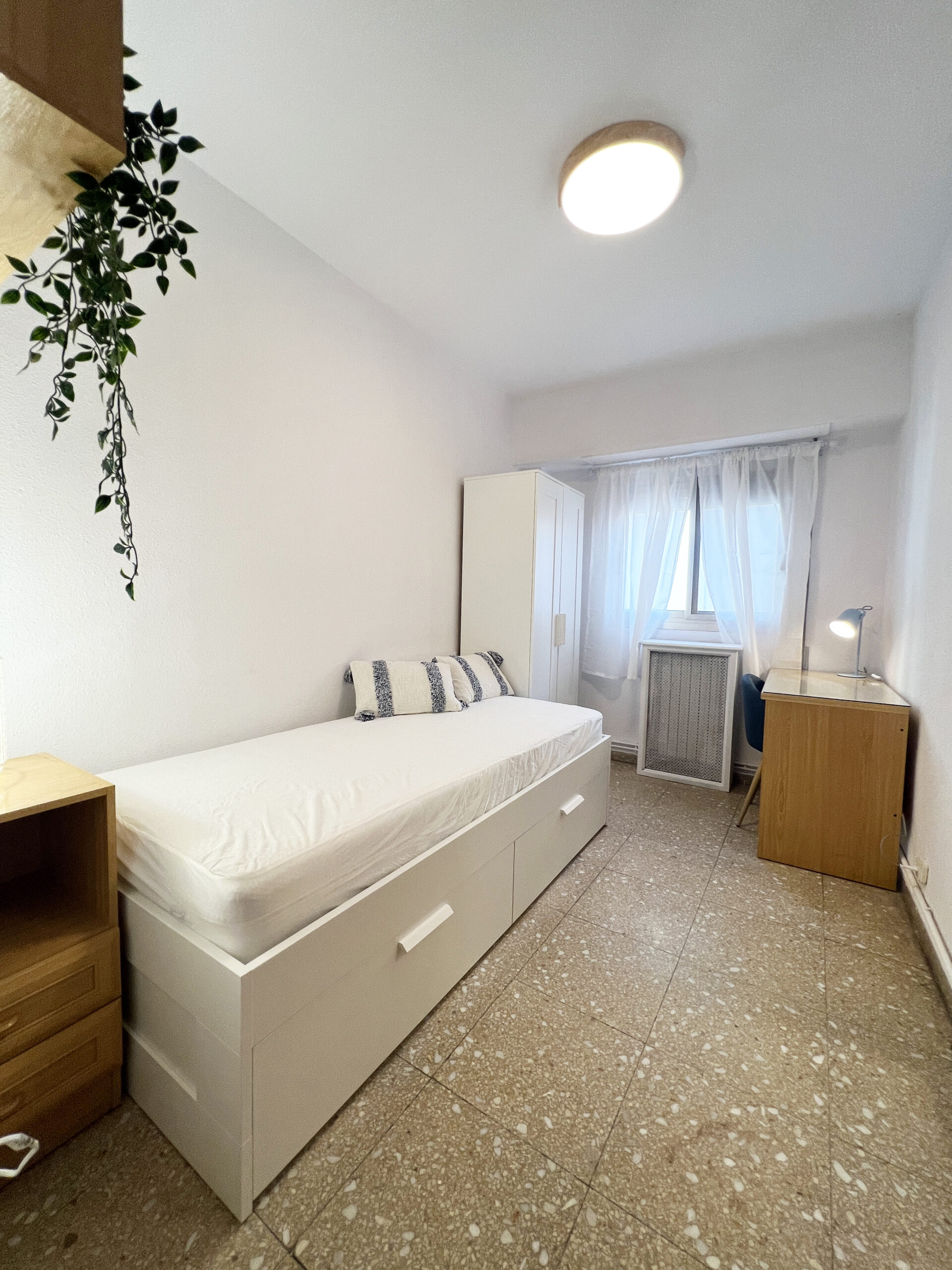 En esta amplia habitación podrás disfrutar felizmente de tu estancia ya que cuenta con todo lo necesario para vivir con todas las comodidades. La habitación cuenta con una cama con dos cajones (almacenaje) de 90×190, colchón que se ajusta a las dimensiones de la cama, protector de colchón, una almohada, un protector de almohada, dos cojines azules con fundas azules y blancas, una mesita de noche de madera con una lámpara, un escritorio de madera, una lamparita de escritorio azul, una regleta, una silla, cortinas blancas, un espejo de pared, una plantita pequeña con macetita blanca y un armario de madera blanco con perchas. La iluminación es a través de una ventana que da a un patio de manzana.