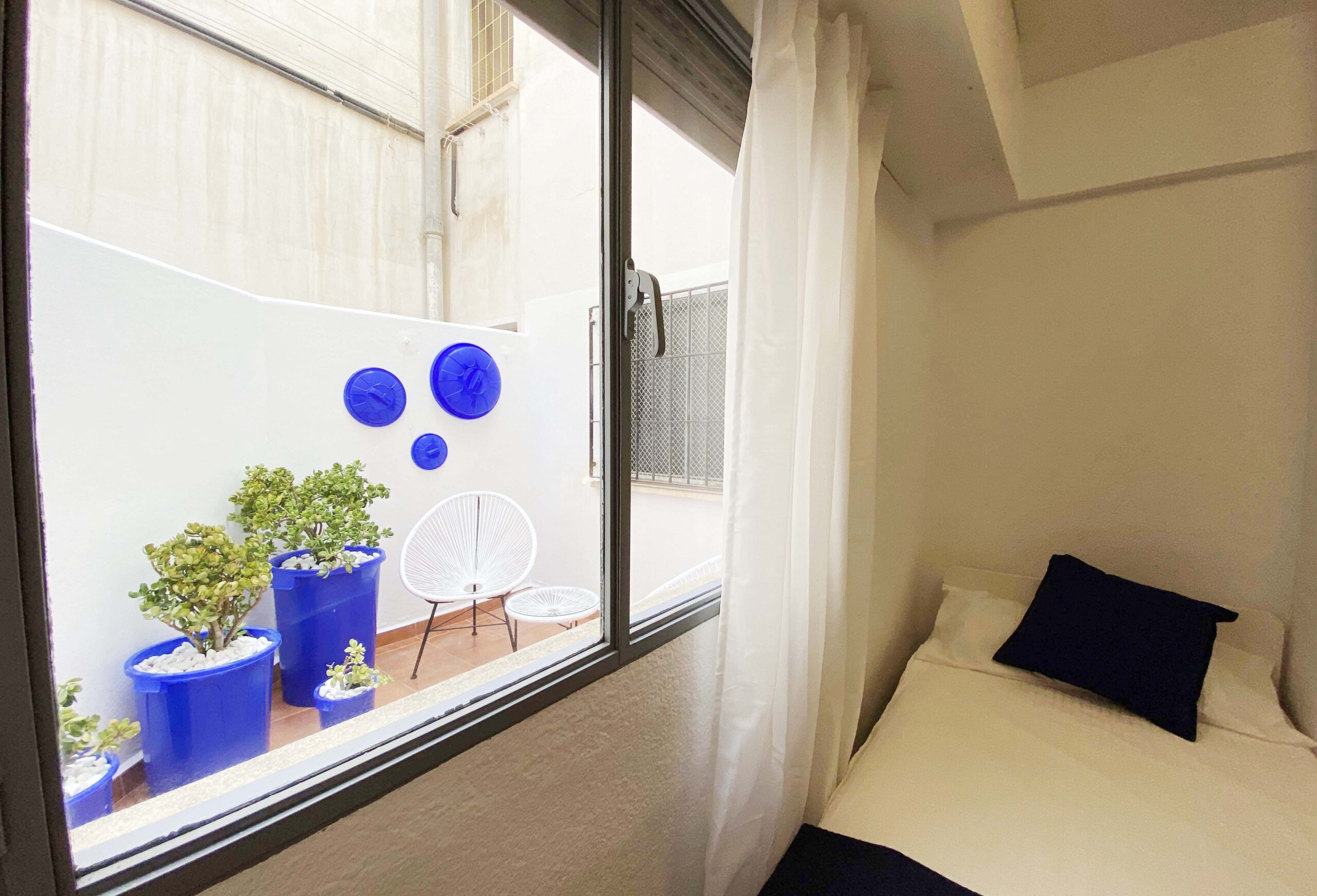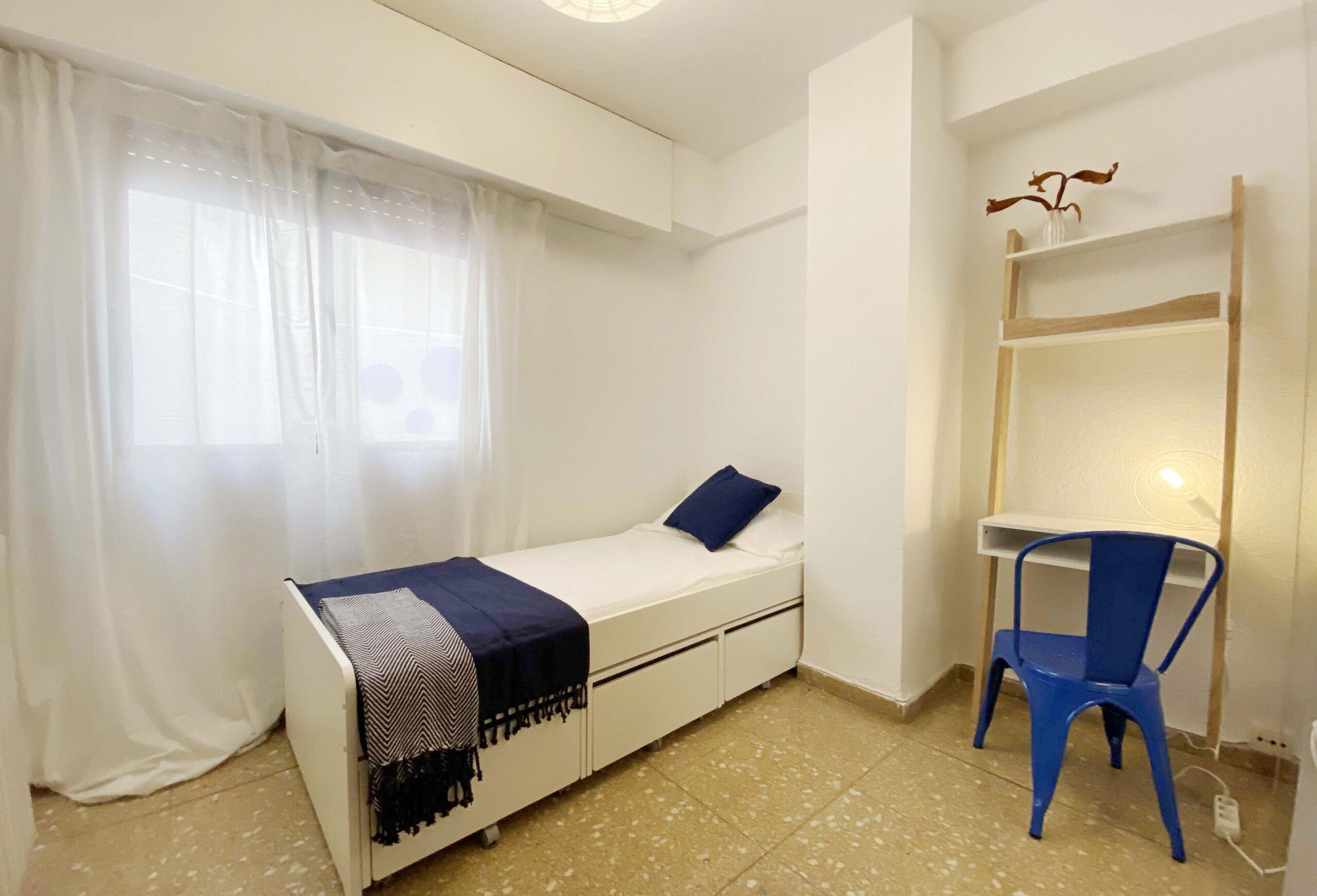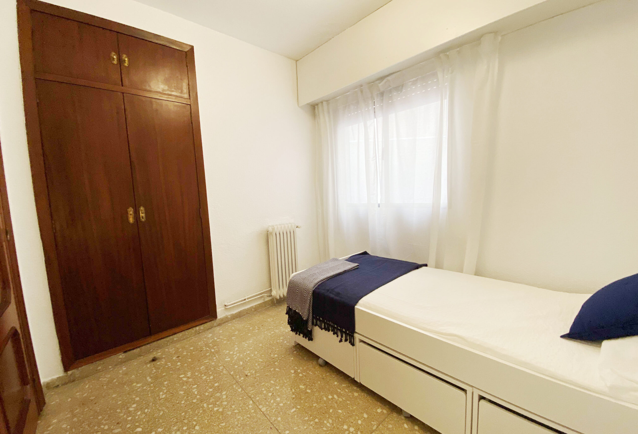Te encantará esta habitación porque pese a su sencillez, está muy bien equipada. Tiene un armario empotrado, un escritorio con silla, cama individual (90×200) con cajoneras, calefacción mediante radiadores de agua y, además, cerradura en la puerta de la habitación para mayor tranquilidad del inquilino. El ventanal a través de la cual se ilumina y ventila, da a un patio interior.