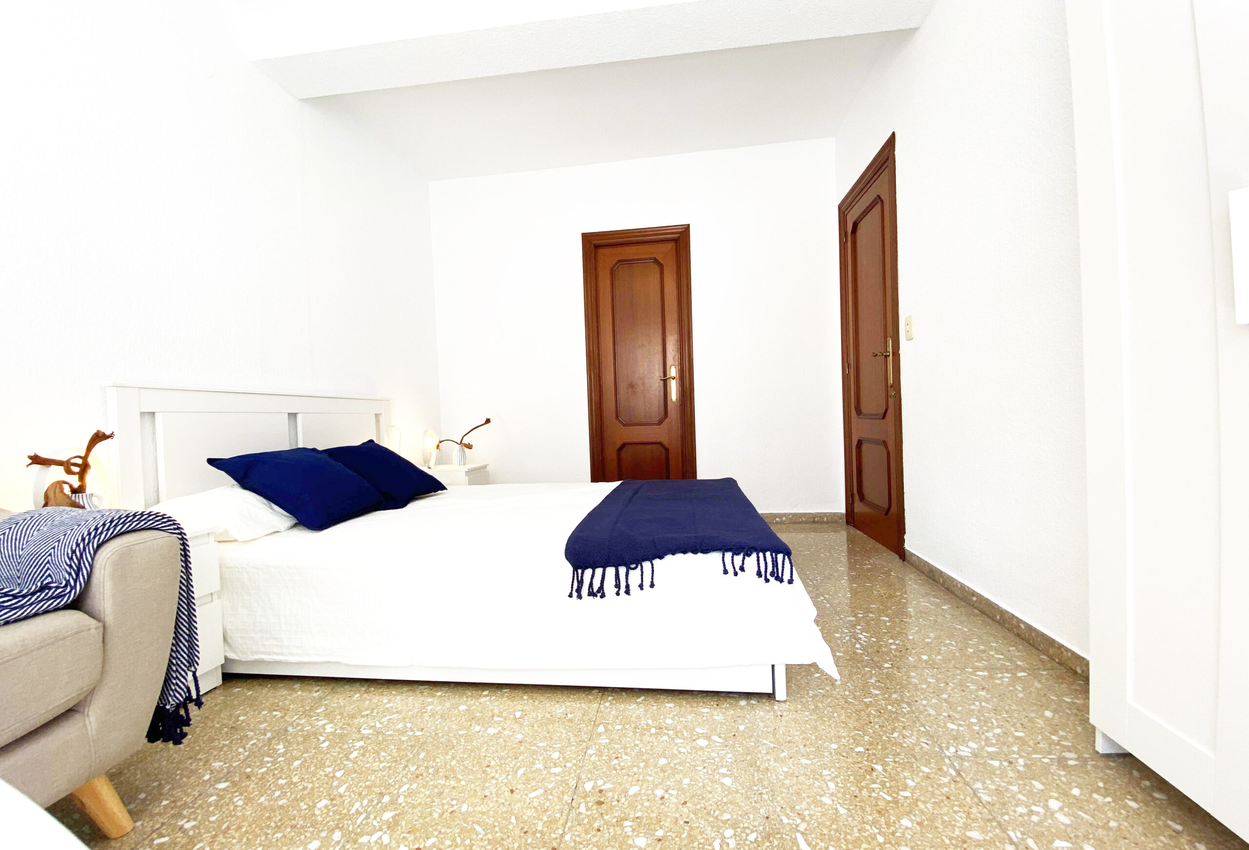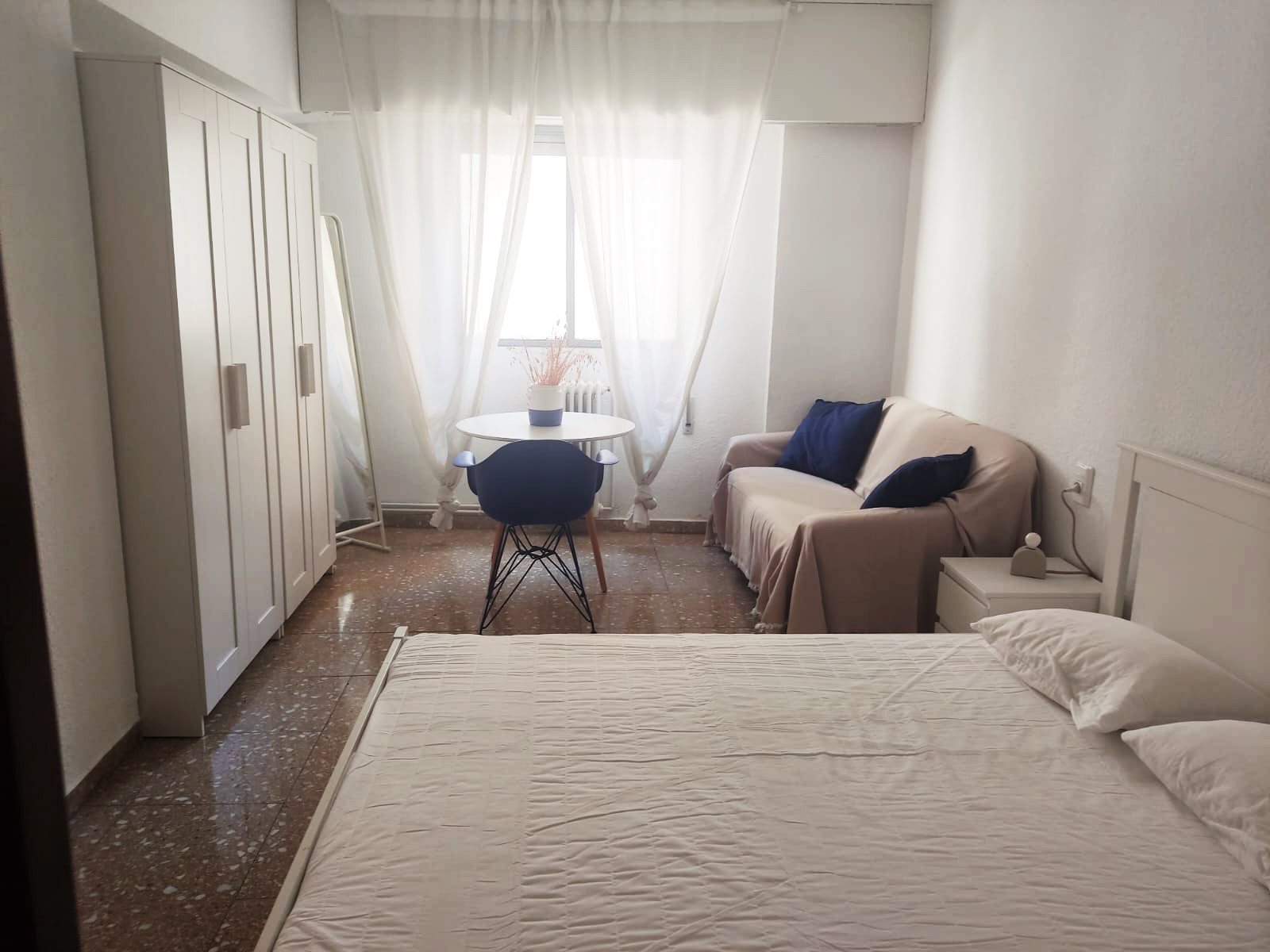 Esta preciosa habitación con baño privado cuenta con todo lo necesario para tener una vida cómoda y agradable en pleno centro de Valencia. Tiene dos armarios de libre instalación con perchas, una mesa redonda con dos sillas, cama doble con cajones (140×200), mesillas de noche, calefacción mediante radiadores de agua y, además, cerradura en la puerta de la habitación para mayor tranquilidad del inquilino. La habitación se ilumina mediante una gran ventana que da a un patio de manzana.
