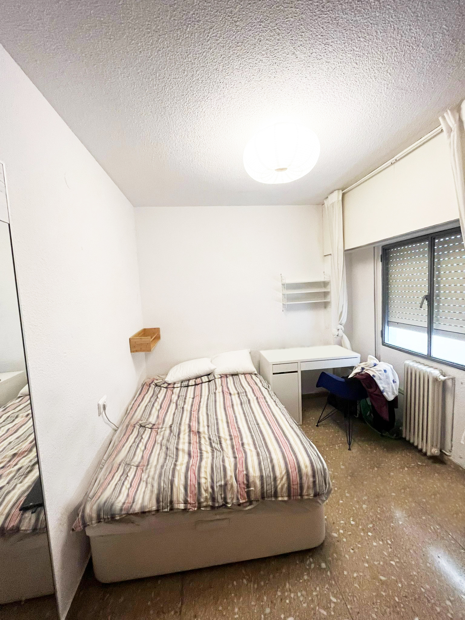 Te encantará esta habitación porque pese a su sencillez, está muy bien equipada. Tiene un armario empotrado con cajoneras y perchas, un escritorio con silla, cama doble con canapé (135×200), calefacción mediante radiadores de agua y, además, cerradura en la puerta de la habitación para mayor tranquilidad del inquilino. La habitación se ilumina a través de una gran ventana que da a un patio interior.